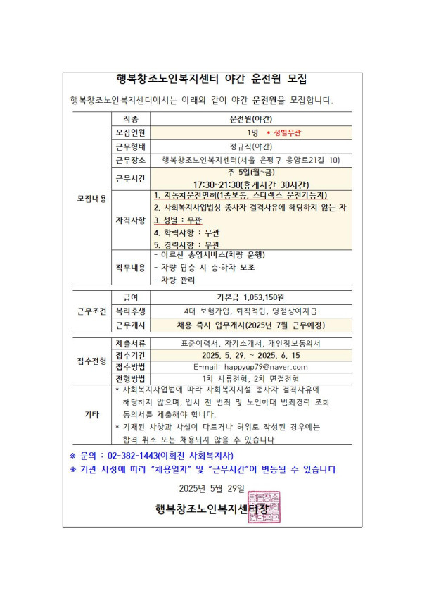 [긴급]행복창조노인복지센터(주야간보호) 야간 운전원 모집(~6/15)