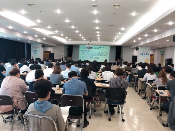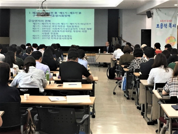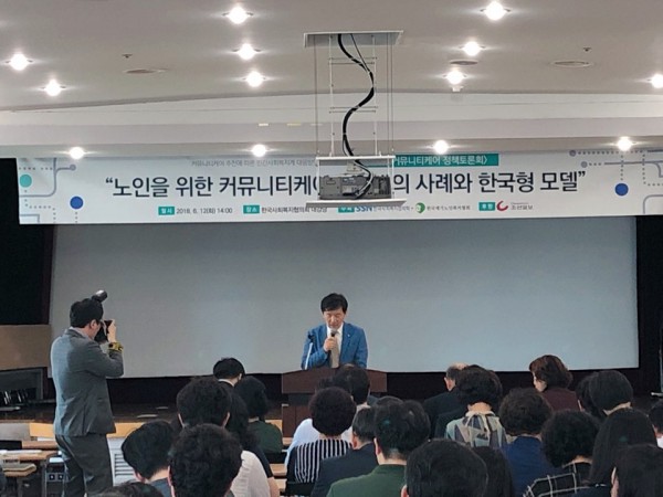 지난 2018년 6월 12일 화요일, 한국사회복지협의회 대강당에서 제 2차 노인을 위한 커뮤니티케어 정책토론회가 개최되었습니다. 이번 토론회 때 한국사회복지협의회 서상목 회장님과 한국재가노인복지협회 김현훈 회장님께서 개회사를 하셨습니다. 이어서 민간사회복지계의 대응방안 모색을 위해 오하시 켄사쿠 교수님(일본사회사업대학 특임교수)의 일본 커뮤니티케어 사례 특강과 임병우 교수님 (성결대학교 사회복지학과 교수)의 향후 한국형 커뮤니티 케어 모델에 대한  발제가 진행되었습니다. 다음 순서로는 앞으로 지자체와 지역사회로 중심화되는 커뮤니티케어 추진에 대해 최재성 교수님 (연세대학교 사회복지학과), 권오균 교수님 (장안대학교 사회복지학과), 전용호 (인천대학교 사회복지학과), 정선남 회장님 (경남재가노인복지협회), 장봉석 회장님 (이양재노인종합센터 센터장), 황승현 단장님 (커뮤니티케어 추진단)께서 한 자리에 모여 토론을 하셨습니다.