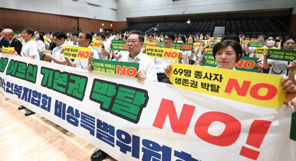 이에 대해 한국재가노인복지협회 외 전국 노인관련 4개 단체는 공동의 성명서를 발표하고 사회복지사 등 69명의 인력감출 계획과 사업비 감액을 즉각 철회하여 고용위기를 해소하고 노인돌봄복지에 만전을 기해줄 것을 촉구했다.